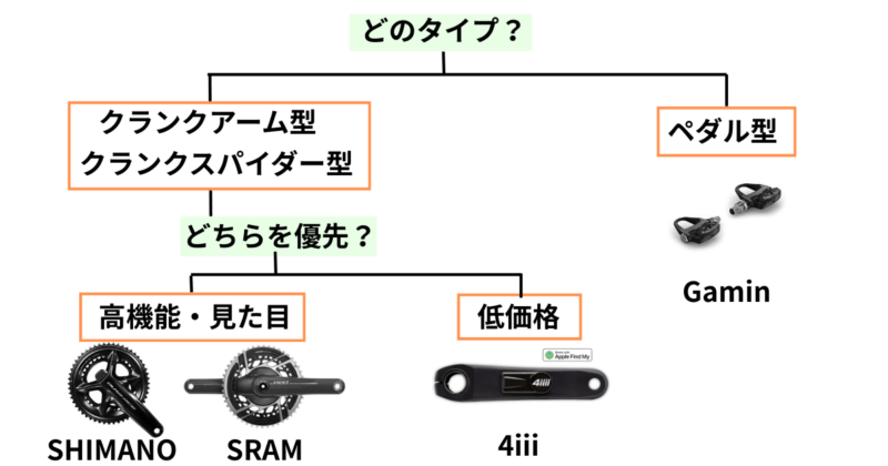 価格や精度、取り扱いやすさなどを考慮した結果クランクアーム型が総合的にはバランスがとれています。